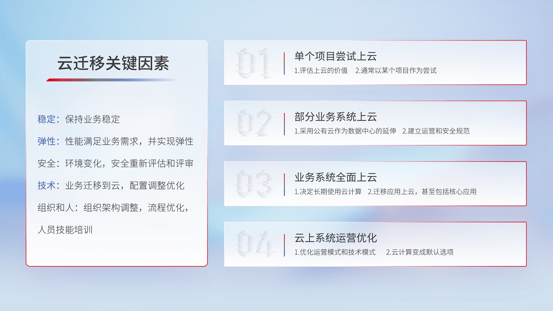 结合实际业务,,从规划设计、、、云平台选型、、、、云原生改造、、、数据迁移、、、集成交付,,,迁移全过程为客户识别最佳上云路径,,,,做好风险识别管理,,,设计网络架构、、、身份权限、、、、安全审计合规、、、、操作审计、、、、日志审计、、、监控告警策略、、、多站点容灾设计等,,,对云上基础设施进行整体规划,,,,提升IT治理水平,,,,以满足弹性、、高可用、、、高性能的需求。。