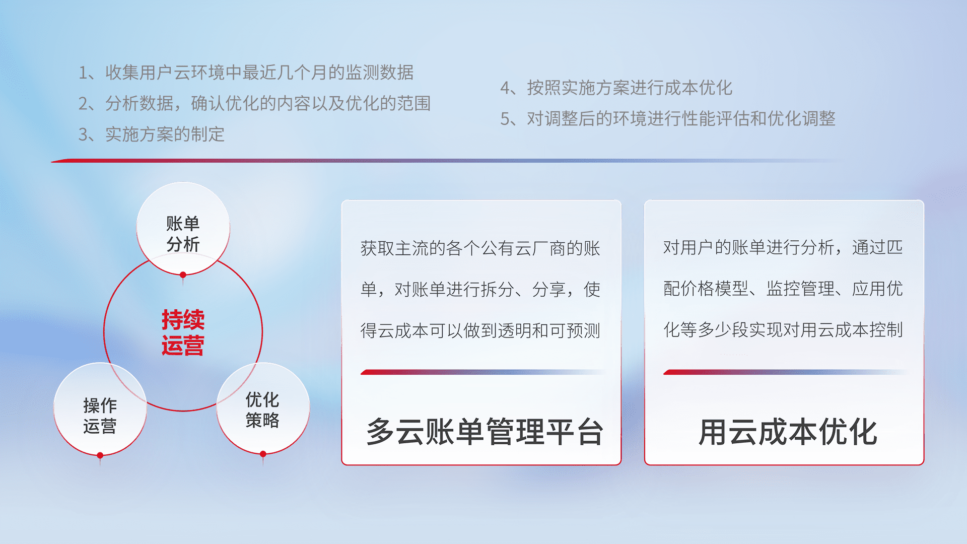 通过多云纳管,,,以统一的资源数据模型把客户的云资源进行抽象和封装,,进而实现对多云资源的统一操作,,,,保障云资源管理的可靠性、、、、稳定性与可用性。。。。量身定制化运维内容,,,配置、、、、开发运维、、补丁管理、、备份、、监控、、、认证和访问管理、、、审计和日常巡检等,,,保障在用云过程中的可靠度,,稳定度以及高可用率。。。。